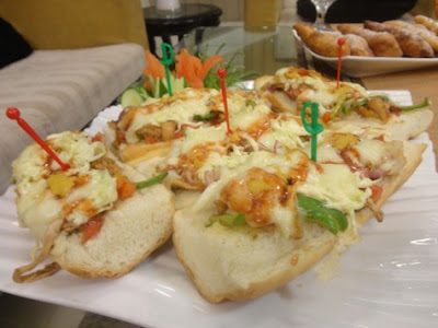 Cut long French loaf into 3 pieces, slit those 3 pieces from centre to make 6 pieces, in a bowl mix together roasted chicken, capsicum, onion, tomato, mixed herbs, ketchup, mix all well, mix cabbage with mayonnaise, butter your French loaf well, spread with filling, top with cabbage and mayonnaise, mustard paste, cheese, bake for 10 minutes until cheese melts, serve immediately.
