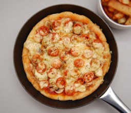 Spread the pizza sauce on top of the crust. Top the sauce with sliced onions, shredded chicken tikka, diced tomatoes, diced capsicum, and sliced mushrooms. Sprinkle 1/2tsp of oregano leaves and 1/2 cup grated cheddar cheese on top of the pizza.