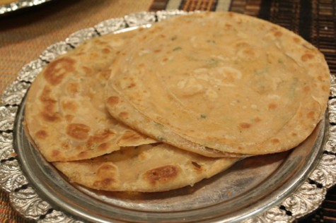 In a bowl mix together 2 cups wheat flour, ½ tsp carom seeds, ½ tsp salt, ½ tsp chili powder, 2 to 3 tbsp oil and make into a medium dough with water as required, make into small balls, roll into a quarter plate size, spread 1 tbsp of ghee all over, cut a slit from the outer edge till the centre, start rolling from the slit to form cone, roll out to a thick paratha, sprinkle mint leaves, press with the rolling pin, cook on a hot griddle, frying on both sides until light golden, serve hot with yogurt.