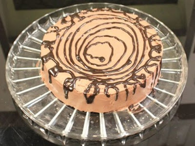 Make sponge cake bake in a 9 inch pan, cut cake into 3 parts, spread butter icing on 1 part, sprinkle with crushed biscuits, pour ceramal sauce, cover with second layer of cake, repeat layer, spread with 3rd layer of cake, cover cake with butter icing then melted chocolate.