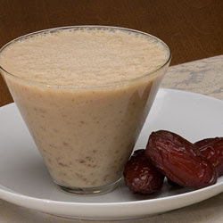 Put dates in a blender, add chilled milk and process till well blended. Add vanilla ice cream and a few ice cubes, blend again. Pour into 4 stemmed glasses and serve immediately.